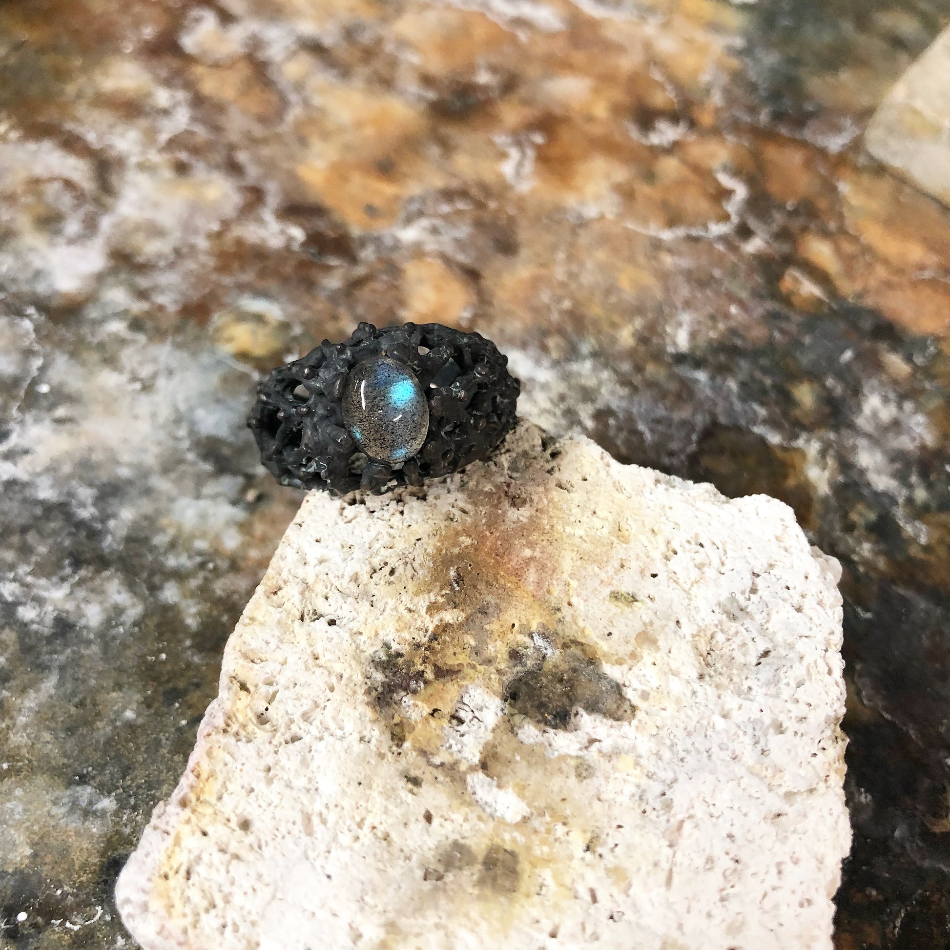 From this distortion, a glowing Labradorite cabochon emerges, a shard of shifting light pushing through decay. Its edges appear softened and consumed.