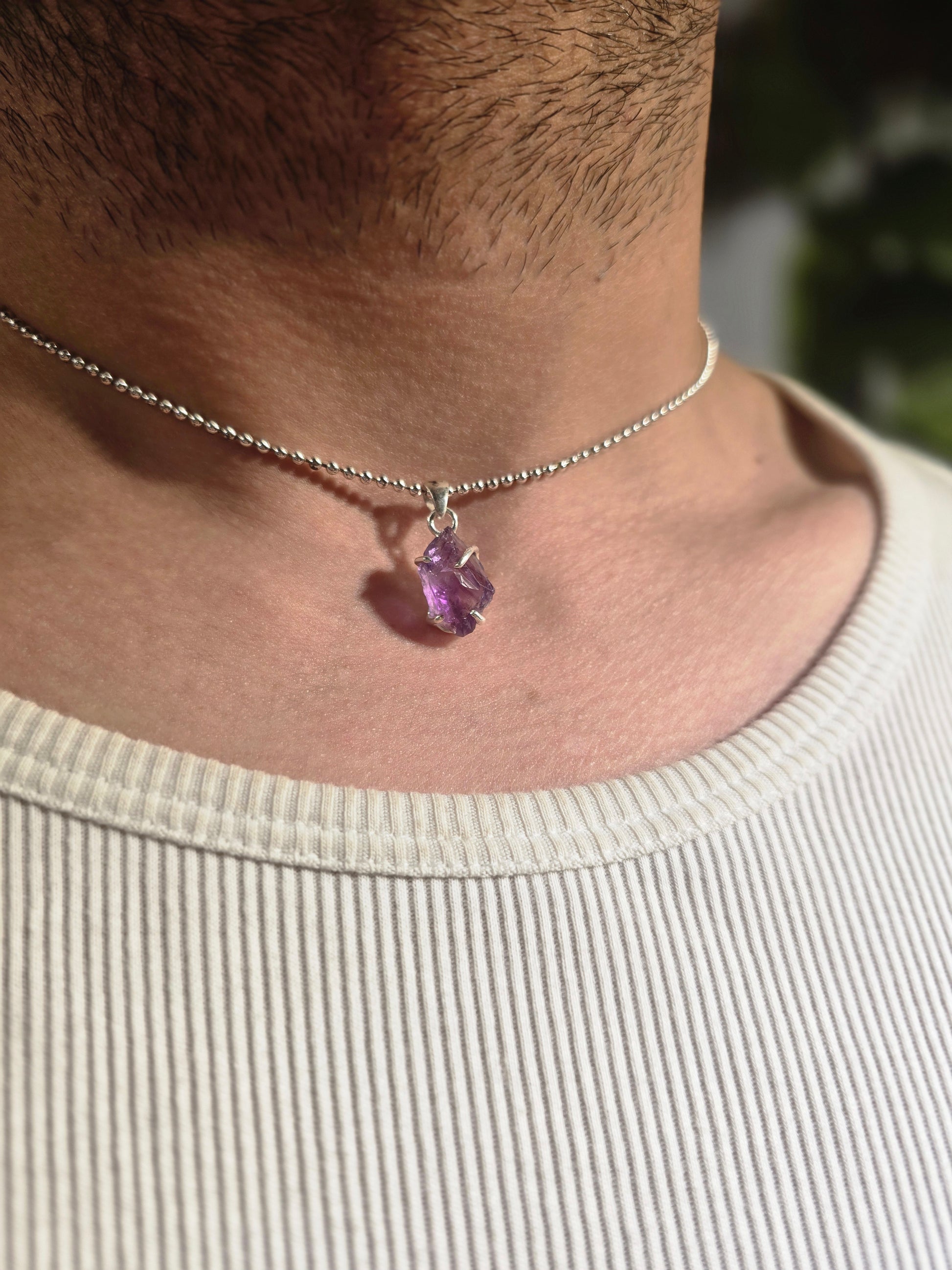 A raw Amethyst set in sterling silver, devoted to Hecate, goddess of thresholds, crossroads, and unseen wisdom. Worn close to the body, this talisman is made for moments of transition—when clarity is needed, and intuition must lead.